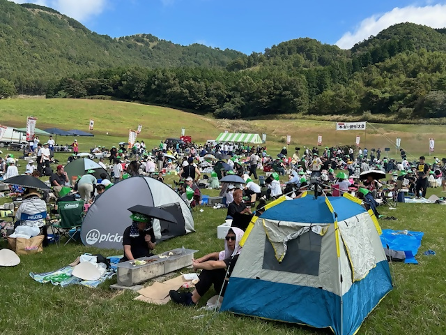 U字溝に網を乗せたシンプルなバーベキューセットが草原に並べられ(シンプルといってもU字溝の重さを考えるとこれだけの数を運ぶのは大変だったろうな~と、スタッフの皆さんご苦労様でした<(_ _)>)。因みに今回の参加者は県内外から約450人でした。